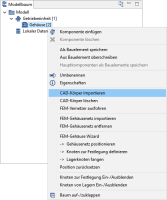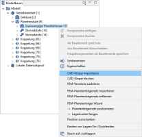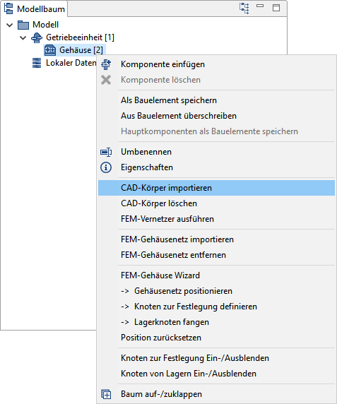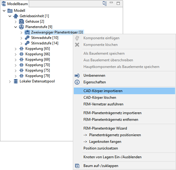 Für das Gehäuse und den Planetenträger besteht die Möglichkeit, CAD-Geometrien zu importieren. Diese Geometrie kann nach erfolgter FEM-Vernetzung und Berechnung der reduzierten Steifigkeitsmatrix für die Berechnung der Wellenverlagerungen im Gesamtsytem verwendet werden. Der Import erfolgt über Rechtsklick im Modellbaum auf Gehäuse -> CAD-Körper importieren oder Planetenträger -> CAD-Körper importieren.
