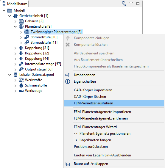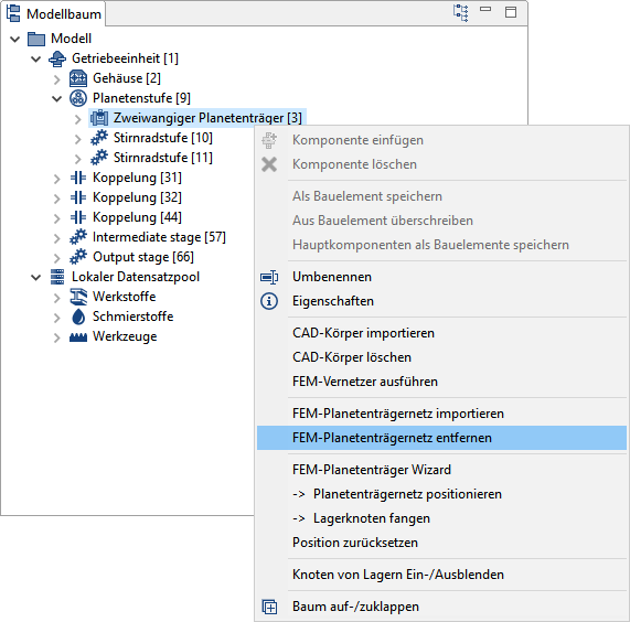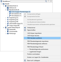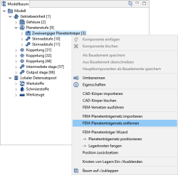 Nun wird das bereits geladene FE-Modell des Planetenträgers entfernt. Unter der Planetenstufe [9] ist der Zweiwangige Planetenträger [3] zu finden: Rechtsklick im Modellbaum auf Zweiwangiger Planetenträger -> FEM-Planetenträgernetz entfernen.