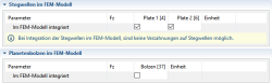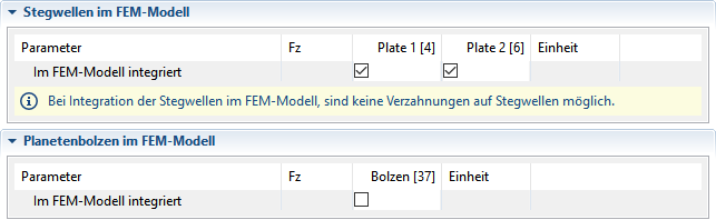 Unterhalb der Parameter für die Streben im Reiter "FEM-Geometrie" finden sich die Checkboxen zur Auswahl, ob Stegwellen und/oder Planetenbolzen (falls vorhanden) mit in das FEM-Modell des Planetenträgers integriert werden sollen. Ist eine Welle integriert, wird diese als Teil des FEM-Modells in der Berechnung berücksichtigt.