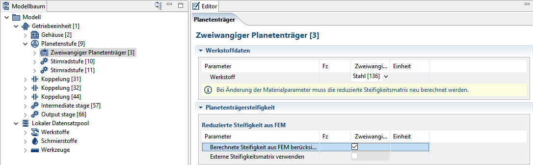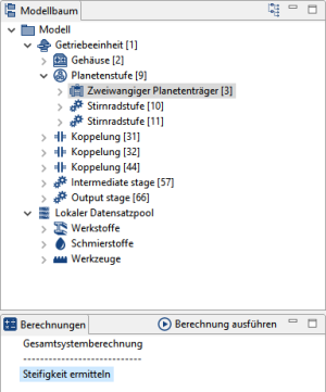 Um die Planetenträgersteifigkeit zu berechnen, muss das Rechenziel "Steifigkeit ermitteln" ausgeführt werden. Nach erfolgreicher Berechnung wird die entstandene Steifigkeitsmatrix in der Gesamtsystemberechnung berücksichtigt.