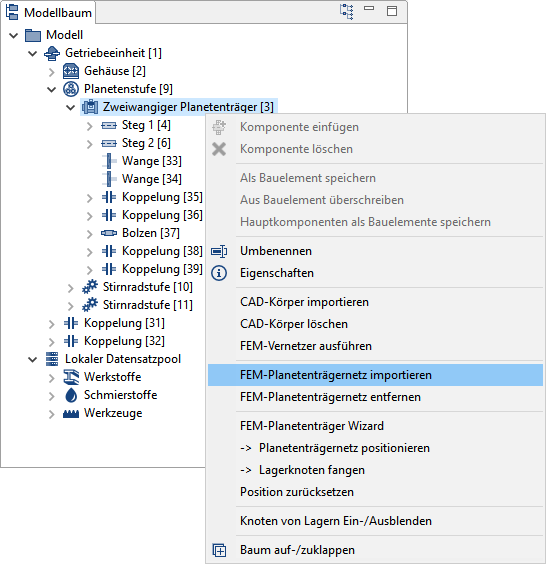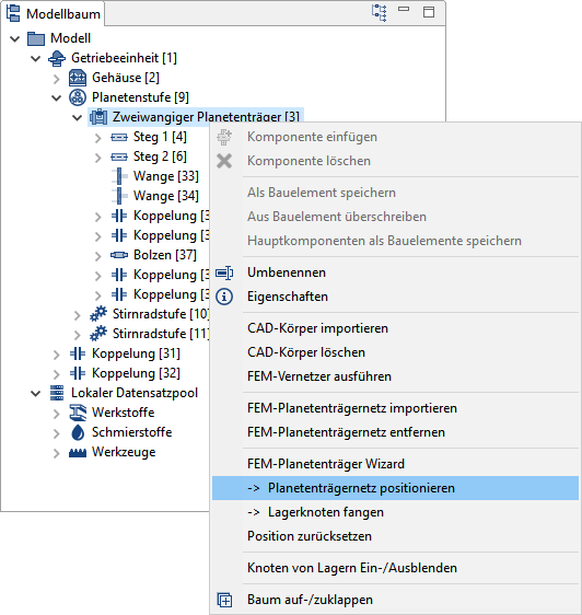 Im nächsten Schritt wird die axiale Position des Planetenträgernetzes bestimmt. Hierfür wird die axiale Position eines FE-Knotens mit dem linken oder rechten Ende einer Koppelung aus der Auswahlliste zur Deckung gebracht. Die Auswahlliste enthält alle mit den Wangen verbundenen Koppelungen und Lager.