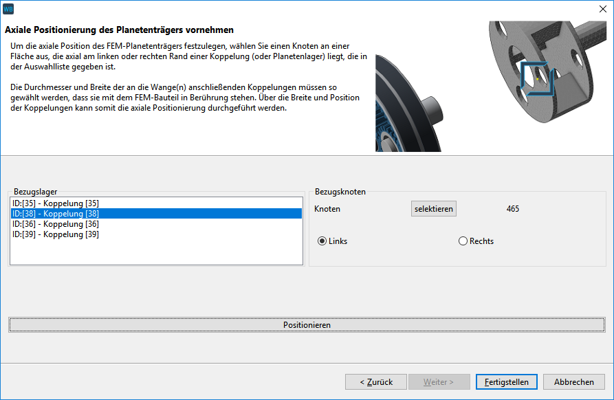 Per Klick auf "Positionieren" wird der Planetenträger axial ausgerichtet. "Fertigstellen" schließt die Positionierung des Planetenträgernetzes ab.