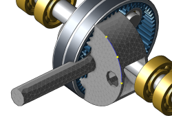 | Die drei Knoten spannen einen Kreis auf, dessen Mittelpunkt dem Mittelpunkt der Zentralwellenachse entsprechen muss. Die Normale auf die Ebene durch die drei Punkte muss in Richtung der Zentralwellenachse zeigen. Die Punkte liegen idealerweise entlang einer Kante des FEM-Modells. Sollte der Planetenträger falsch herum im Planetengetriebe sitzen, kann die "Achsenrichtung umgekehrt" werden. Falls das Getriebe den Planetenträger verdeckt, kann der Abstand zwischen Getriebe und Planetenträgernetz über den Schieberegler variiert werden. Diese Funktion dient nur der besseren Übersicht und hat keinen Einfluss auf die Positionierung. |