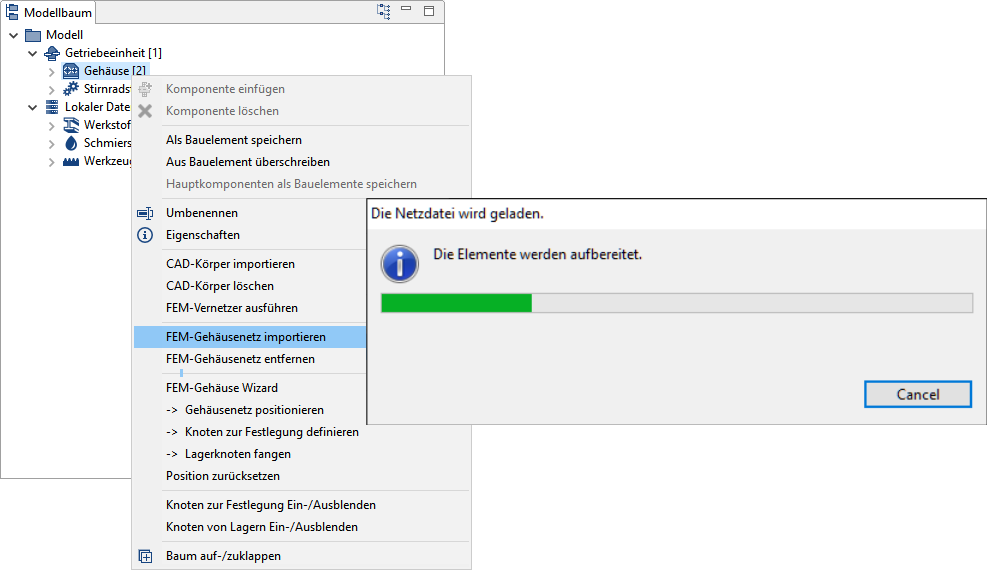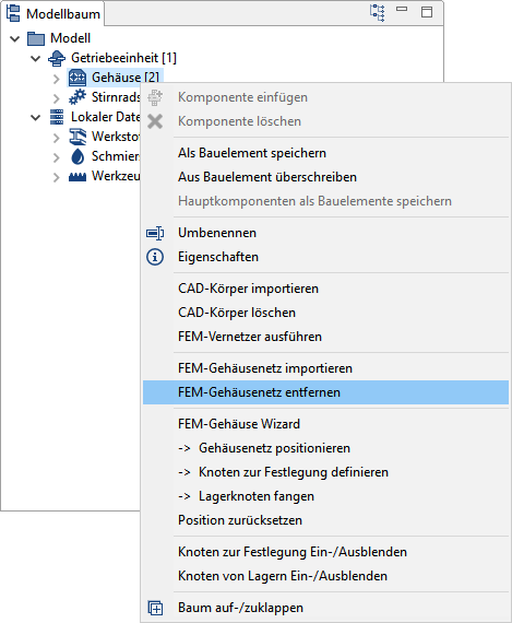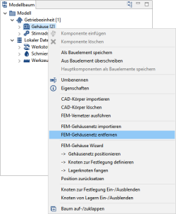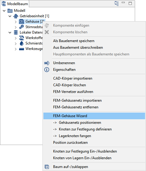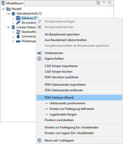 | Die Schritte können nach der Positionierung auch separat ausgeführt werden (Menüeinträge unter FEM-Gehäuse Wizard). Dies kann z.B. dann sinnvoll sein, wenn die Fundamentknoten neu festgelegt werden sollen, ohne die Position des Gehäuses zu verändern. |