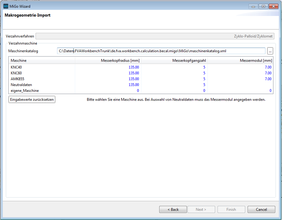 Das Herstellverfahren (Gleason 5-Schnitt oder Zyklo-Palloid) wird aus den eingegebenen Neutraldaten (Zahnlängslinie und Zahnhöhenverlauf) bestimmt und kann nicht geändert werden.