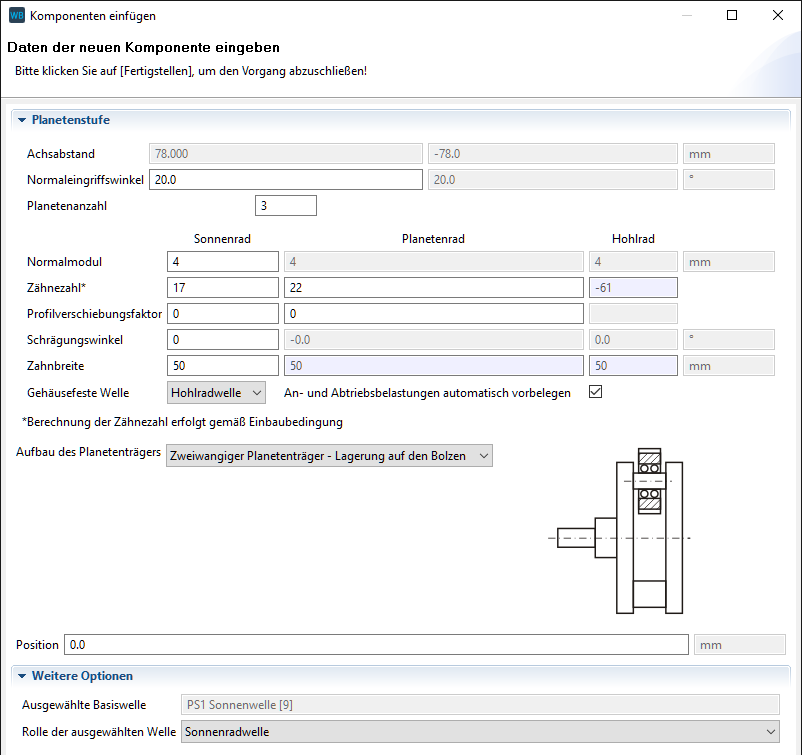 Mit Hilfe des neuen Planetenwizards kann der Benutzer nun die Getriebestruktur neu anlegen. Der Typ der Planetenstufen wird berücksichtigt, wobei die Planetenwellen auf dem Planetenbolzen oder in den Wangen gelagert werden können. Ferner sind beliebige andere Welle-in-Welle Lagerungen möglich, so dass Planetengetriebe frei gestaltet werden können.