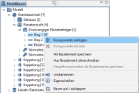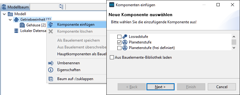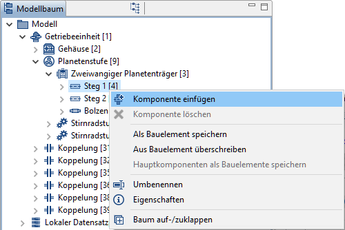 Um die erste Planetenstufe einzufügen: Rechtsklick auf die Getriebeeinheit ® Komponente einfügen ® Planetenstufe
