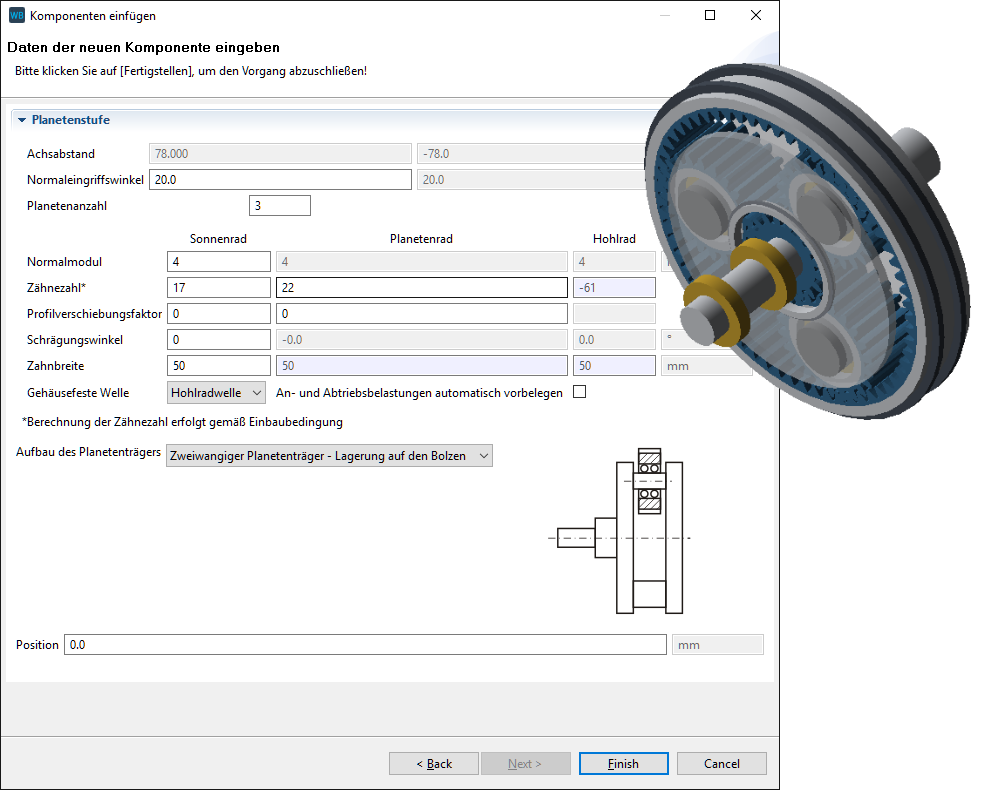 Über die Position wird die axiale Anfangskoordinate der neuen Planetenstufe angegeben. Sie entspricht dabei der Anfangskoordinate der breitesten Verzahnung.