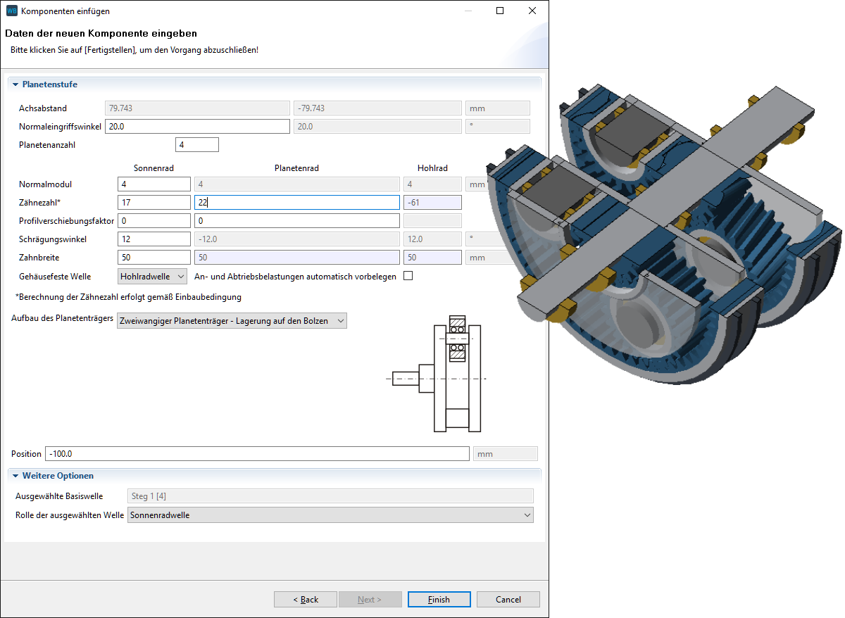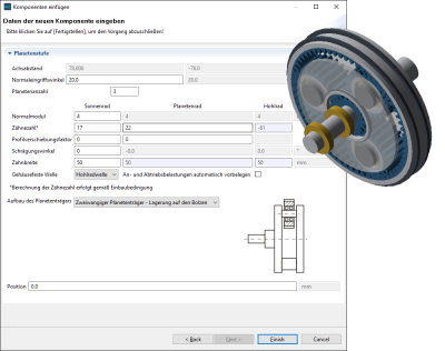 | Auch wenn die Komponenten der Planetenstufen im Anschluss ersetzt werden, sollten die Grunddaten im Wizard korrekt eingegeben werden. Damit werden im weiteren Positionierungsprobleme vermieden. |