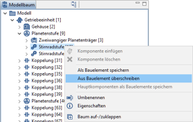 Hierfür im Modellbaum die Wellen, Lager und Stirnradstufen auswählen und nacheinander ersetzen. Es können nur Komponenten gleichen Typs ausgetauscht werden.